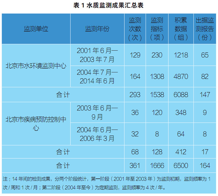 自2001年开始,将1999年开始投入运行的“四博连某工程”和2001年开始投入运行的“西郊某工程”定为长期水质监测定点工程。从2001年6月至今常年委托北京市水环境监测中心对单井循环地能采集系统井水出水、回水进行检测。在2003年至2006年期间又委托北京市疾病预防控制中心对单井循环地能采集系统井水出水、回水进行定期检测。北京市水环境监测中心对两项工程的监测频率由初期的重点指标连续监测到2004年调整为全项指标定期监测。到目前为止北京市水环境监测中心对定点工程采集系统制冷、供暖期的井水连续跟踪监测已达14年。14年间获得检测报告164份,累计了近7000组检测数据。详见表1。