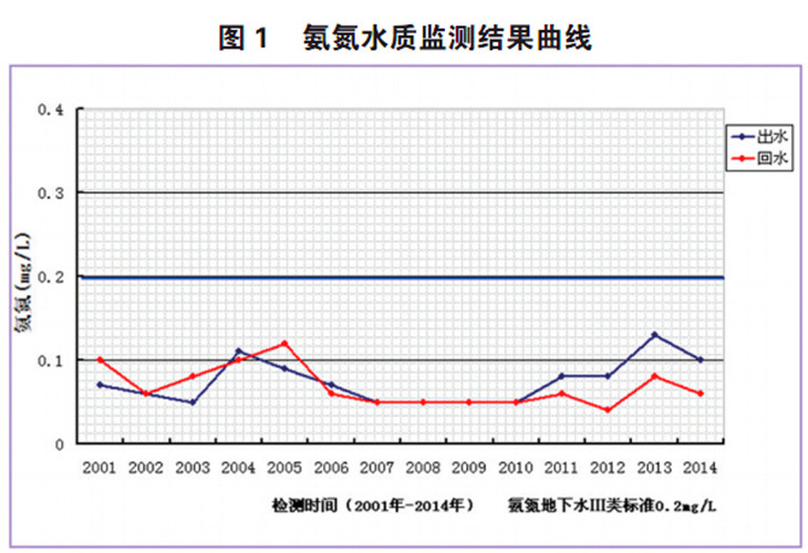 自2001年至2014年对该工程井点的水质监测,各项水质监测指标均无明显变化。下面以氨氮指标历年水质监测结果数据曲线为例。